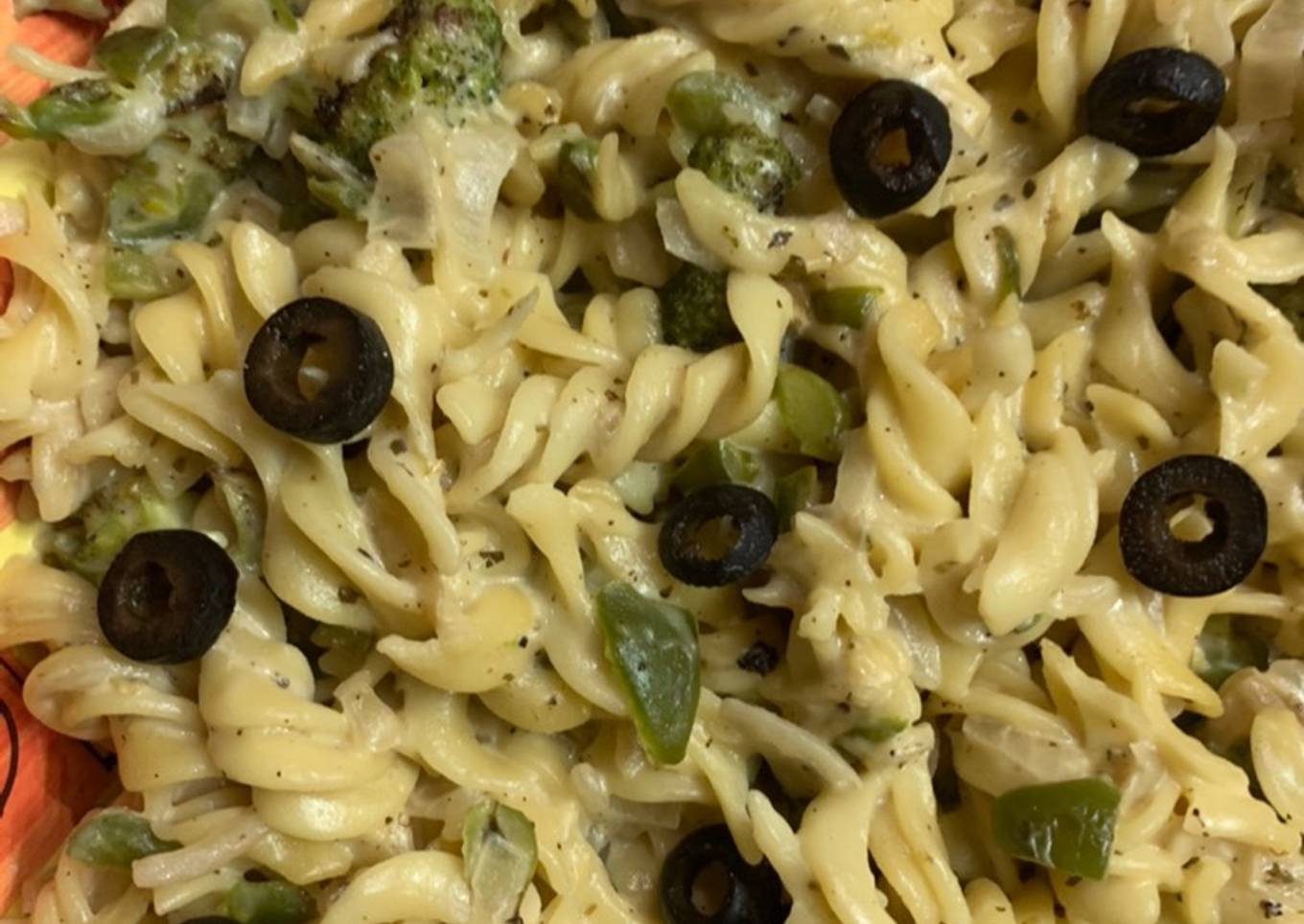- In a pan add little butter and add chopped veggies, saute for 2-3 minutes, cover with lid and cook for 3-4 minutes. Now take off the lid and add the pasta and prepared white sauce, mix well and top up with olives. Serve hot