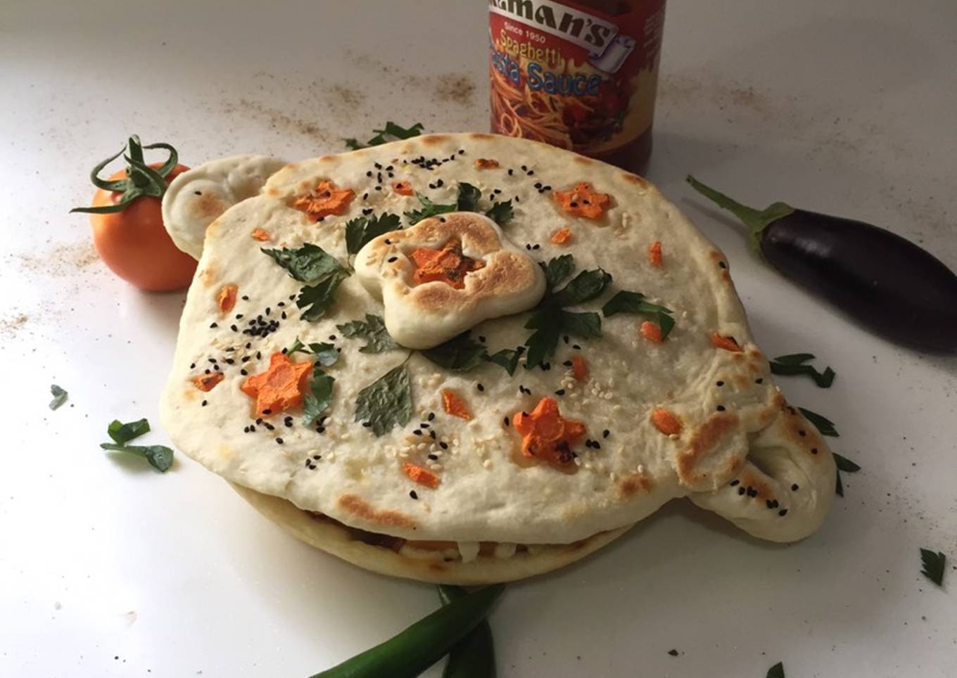 - After dough rise..grease the frypan and spread dough like fry pan..hole with fork..apply silver foil..put big bowl on the silver foil...now bake in stove on slow flame..when the dough change the colour than cook another side..it's take 10 min each side..now pot ready