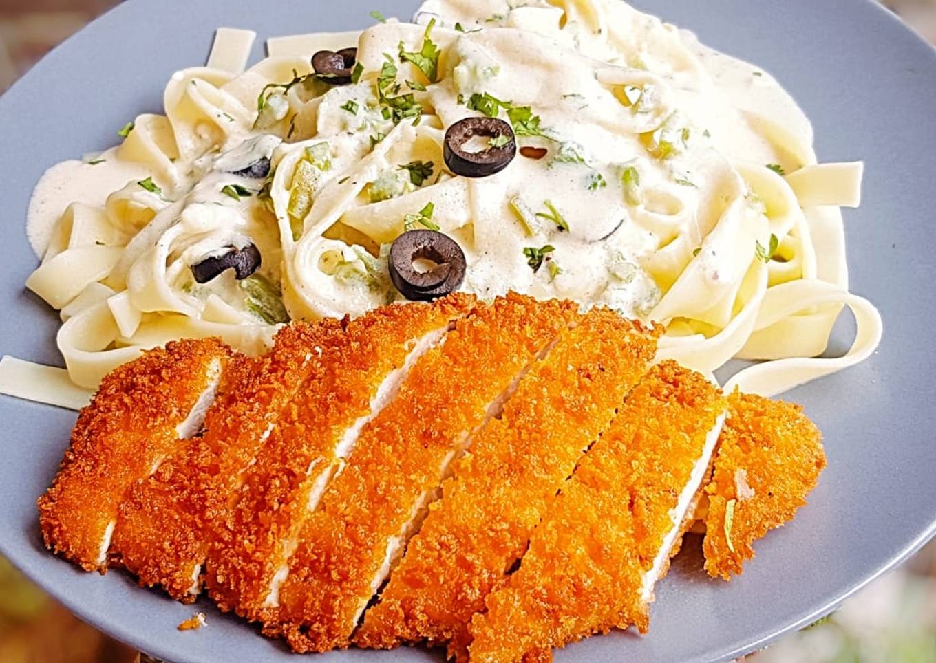 - For Chicken Fillet: Marinate chicken fillet with soya black pepper salt and garlic. Dip in beaten egg and crumb coat then deep fry cut into slice and put on the pasta garnish with olives and coriander
