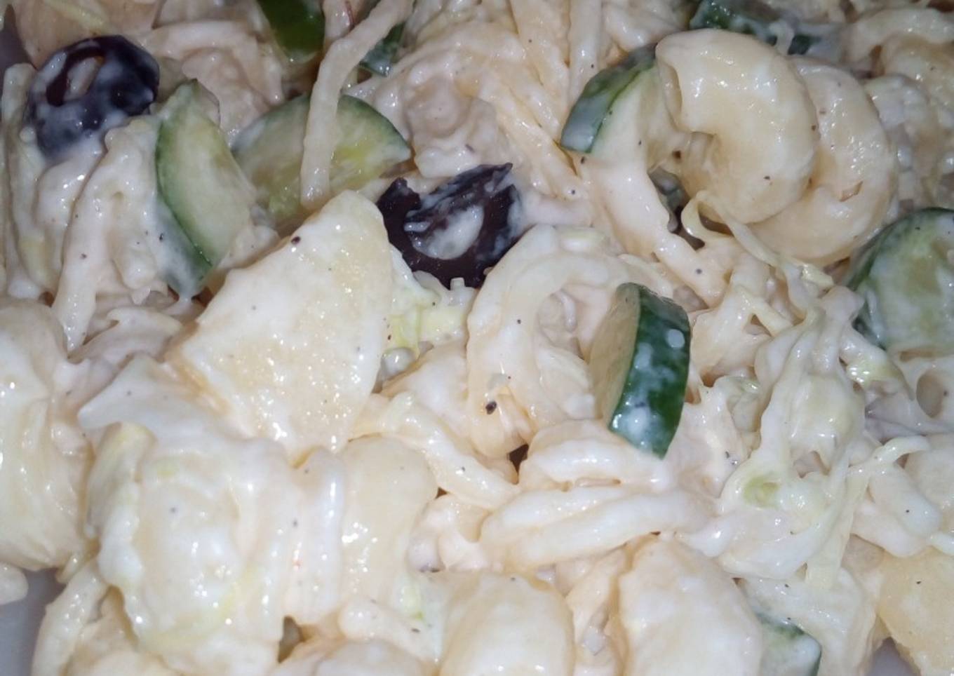 - In a bowl add yougurt, fresh cream, mayonnaise, all vegetables, salt & pepper, mix it well & then add pasta into it, garnish with some olives, keep it into a freezer for 1 hour & enjoy chilled.