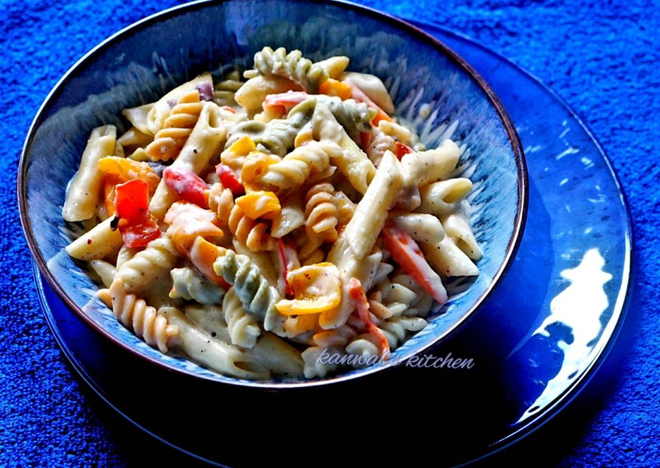 - Top it with cheese slices annd cover it.Cook for 2-3 minutes.colorful white sauce pasta is ready.