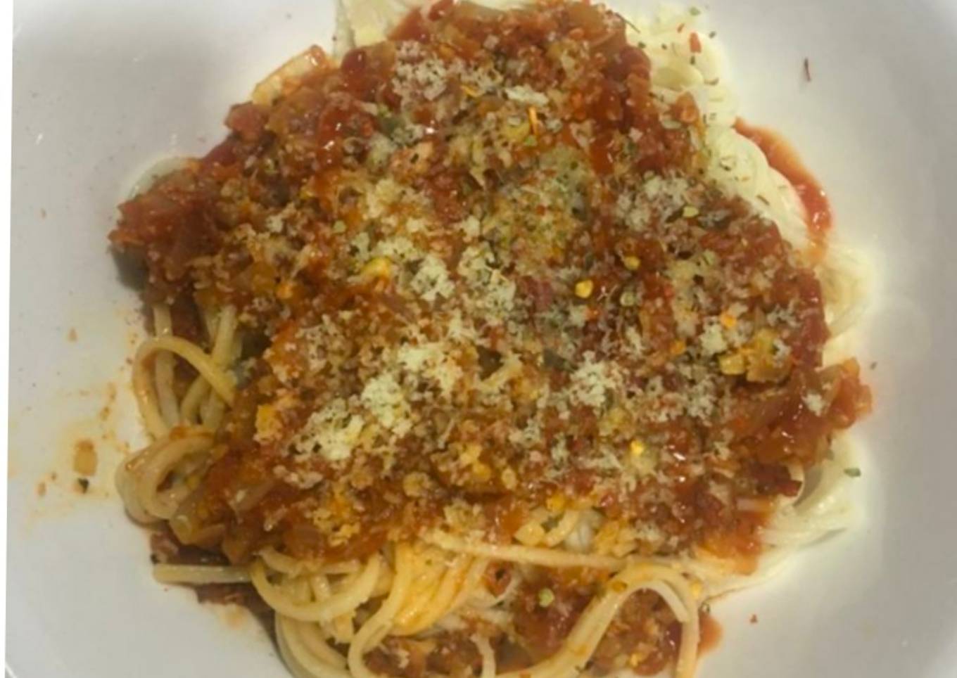 - Plate the spaghetti pasta and pour in the red sauce.Garnish with some parmesan cheese and sprinkle some chilli flakes and oregano and drizzle some tomato ketchup over it.Restaurant style Spaghetti pasta is ready to be served.Enjoy with some garlic bread.