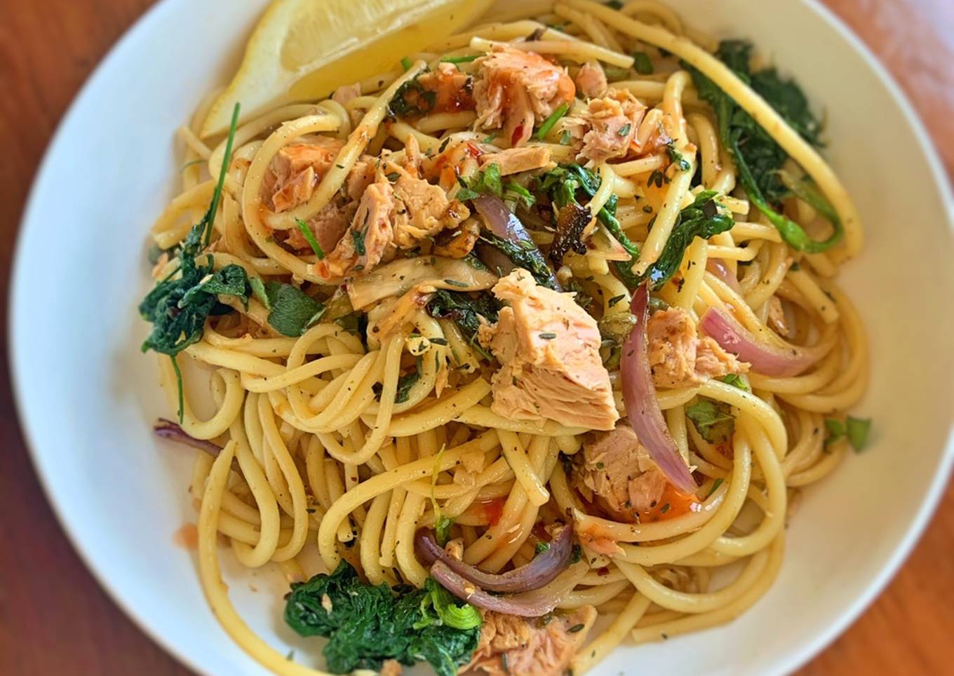 - Mix together well and finely add the tuna mixing it in but keeping it in chunks. I finely drizzled sweet chilli sauce over and served with a wedge of lemon. Season well!