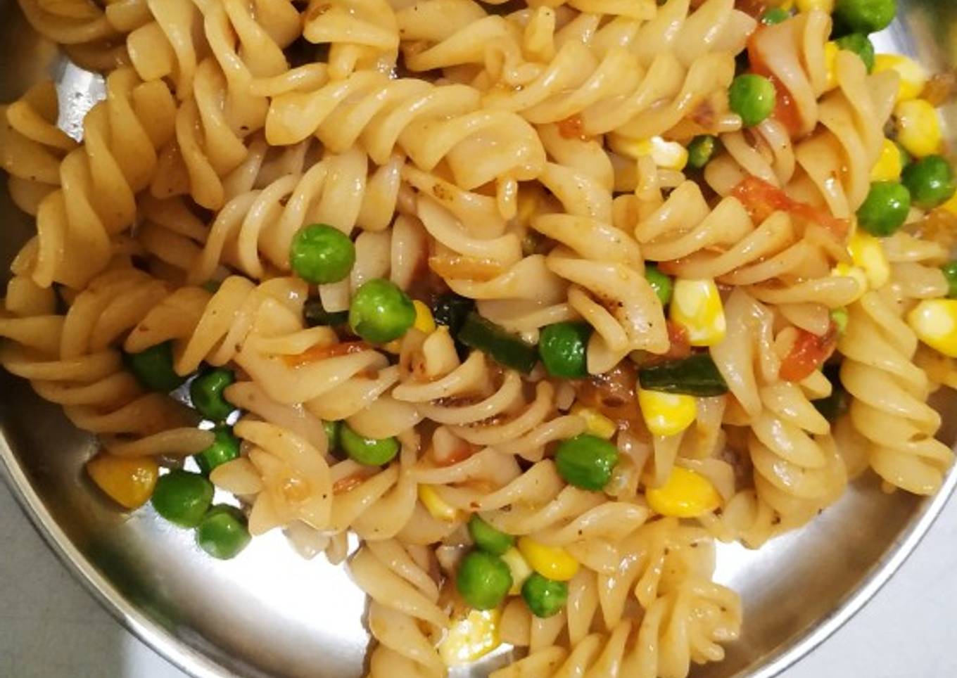 - In pan place refined oil and the add chopped onion chillies and let it fry for 1 minutes then add tomato salt and turmeric fry for 2 min. Then add pasta, corn and pea and fry for 2 min and add 1tsp tomato sauce for batter taste