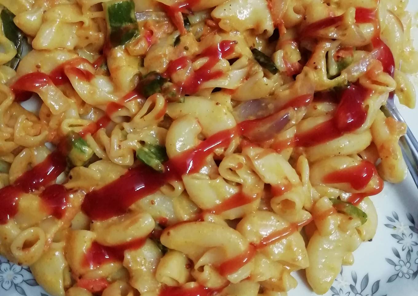 - Heat a pan, add oil, saktey all onion, capsicum and tomato, add all spices, add boil pasta and malai and mix well.