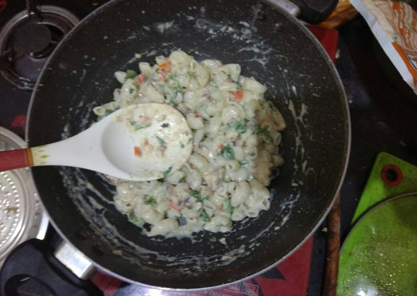 - Add the cooked veggies and pasta in the sauce,mix well add salt and pepper according to ur taste..it's optional to add chopped coriander leaves or spring onions..serve it during warm condition...