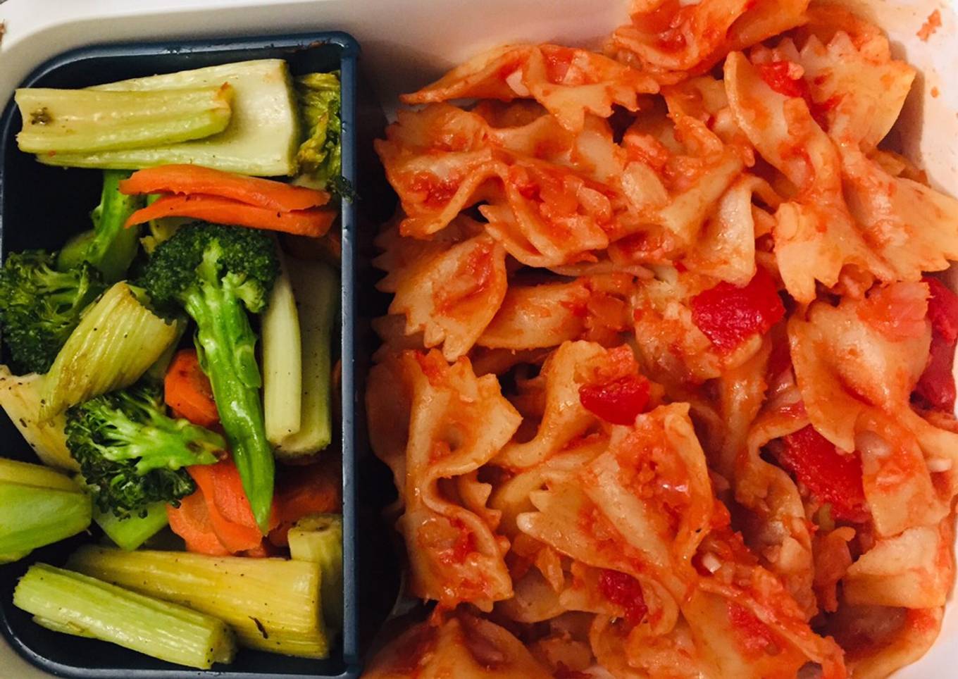 As for the number of servings that can be served to make Pasta with cheese-tomato herb sauce & stir fry vegetables is 1 serving. So make sure this portion is enough to serve for yourself and your beloved family.