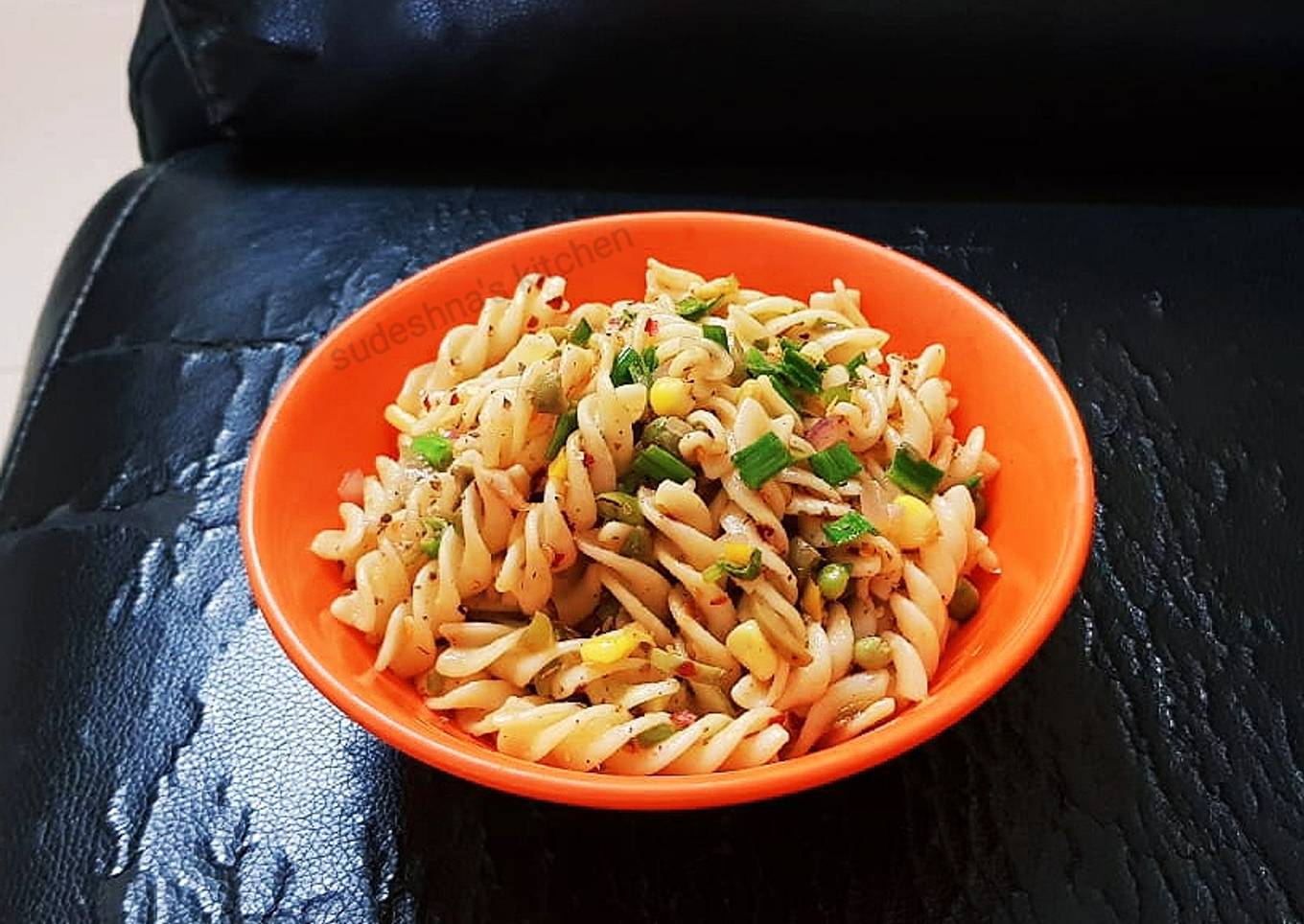 - Now heat a pan add 3 to 4 tbsp of oil. Now add all the chopped veggies, add some salt and sugar and fry them till golden. Now add the pastas and add vinegar, pasta sauce, green chilli sauce, mixed herbs and chilli flakes and if required, a pinch of salt. Add the chopped spring onions and give it a mix. Cook it for about 5 mins and serve it hot..