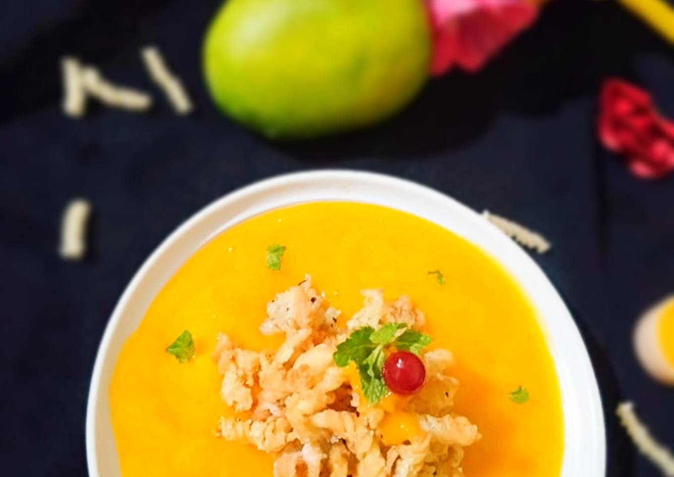 - Now take a serving bowl add pasta in it's middle and pour the mango puree in it's periphery. Garnish with mint leaves and cherry. Enjoy!