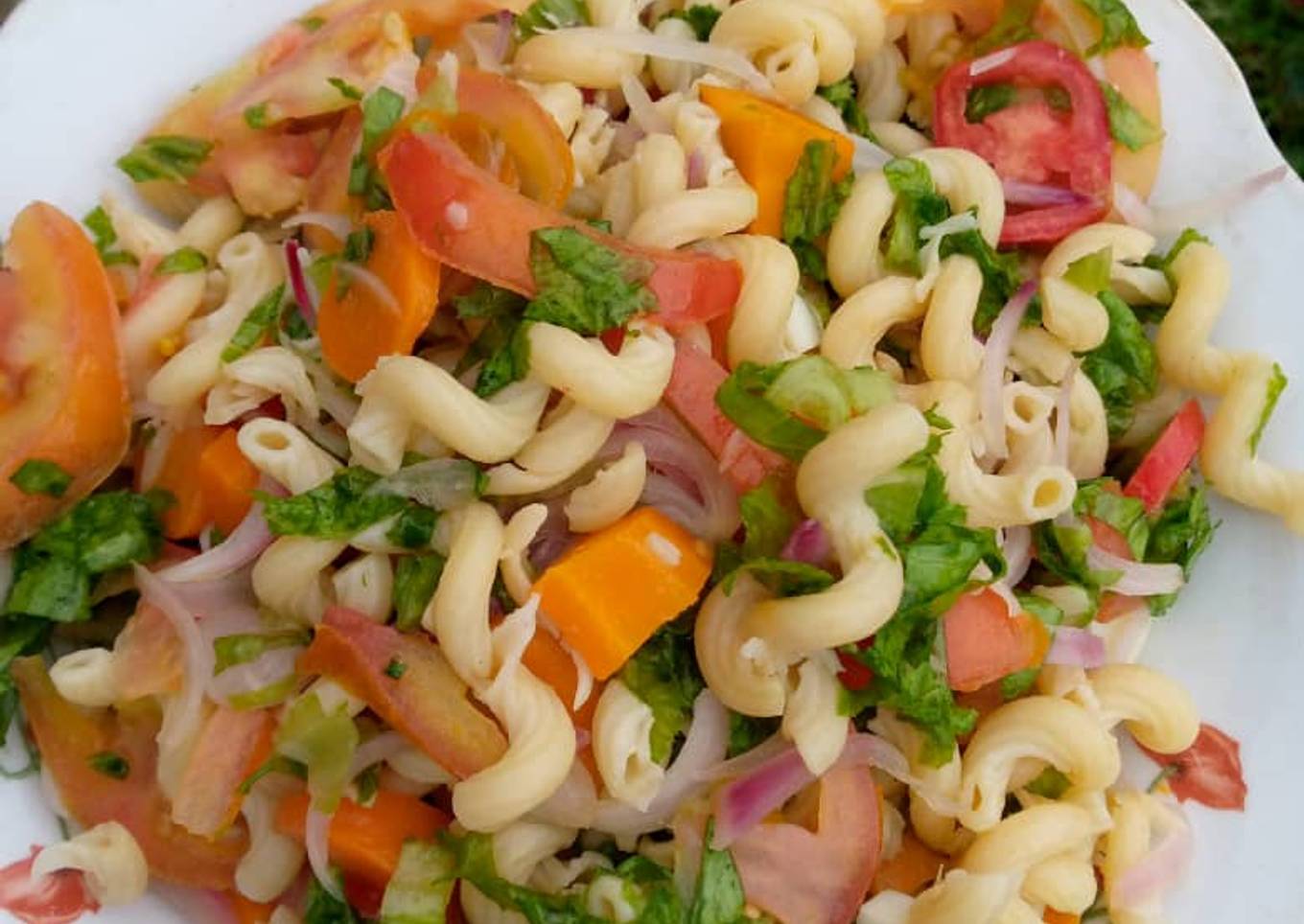 - Start dressing the salad; alternate the ingredients in a clean bowl; pasta,tomato, onion,carrot,eggs,lettuce, sprinkle salt and repeat the process until the ingredients are finish.