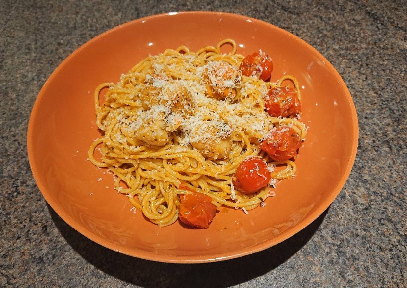 - Add the pasta to the sauce and toss well to combine. Add the scallops and cherry tomatoes and gently toss and heat through. Season with salt and pepper.