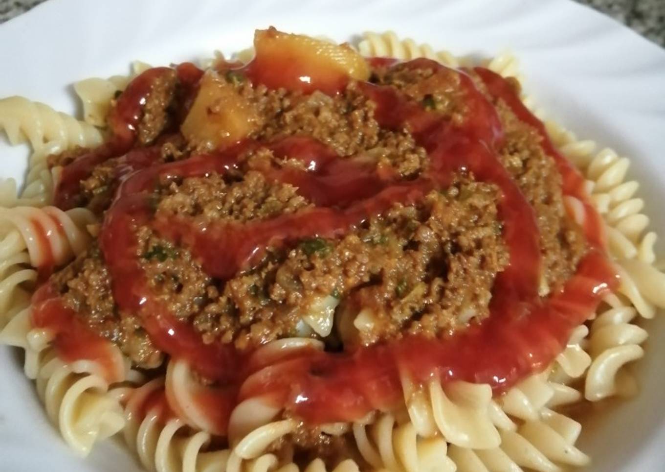 - Now put the pasta in a plate, pour the kima on it. Serve like that or with some tomato and chilli sauce