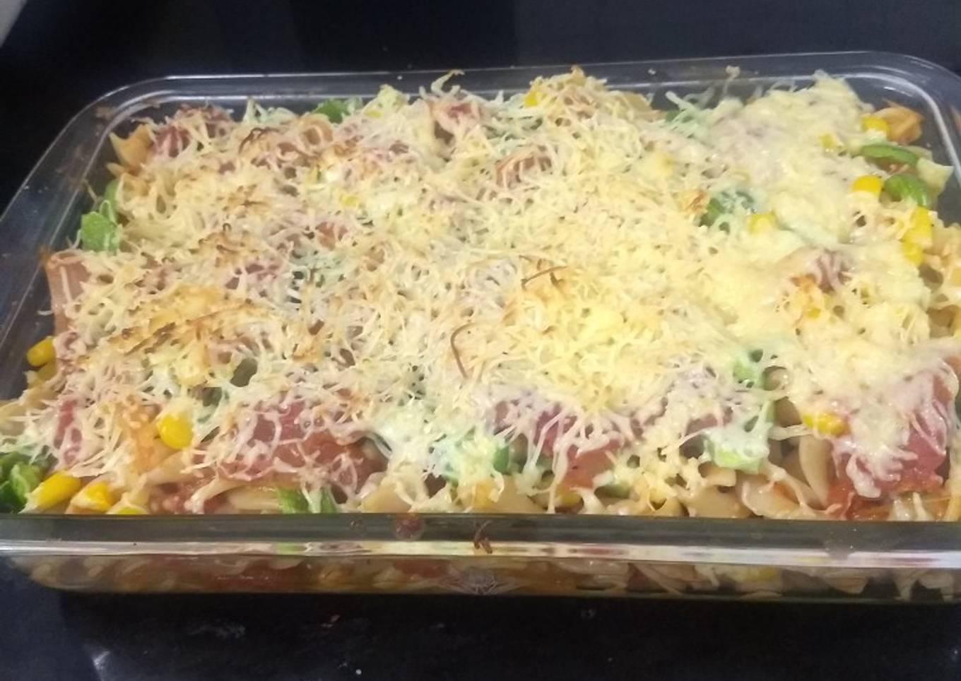 - Take baking dish arrange pasta spread capsicum and corn spread 1/4 portion of remaining sauce. Spread grated cheese and bake at 200 degree for 10 mnts andserve hot.