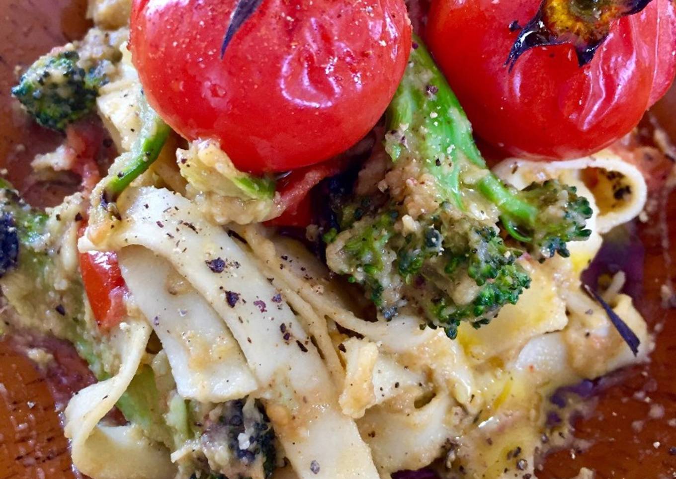 - Add the cooked broccoli and two of the tomatoes, they will be quite soft so will mix in with the avocado. Drain the pasta and mix in, making sure it's well coated. Serve with the remaining tomatoes and season with black pepper.