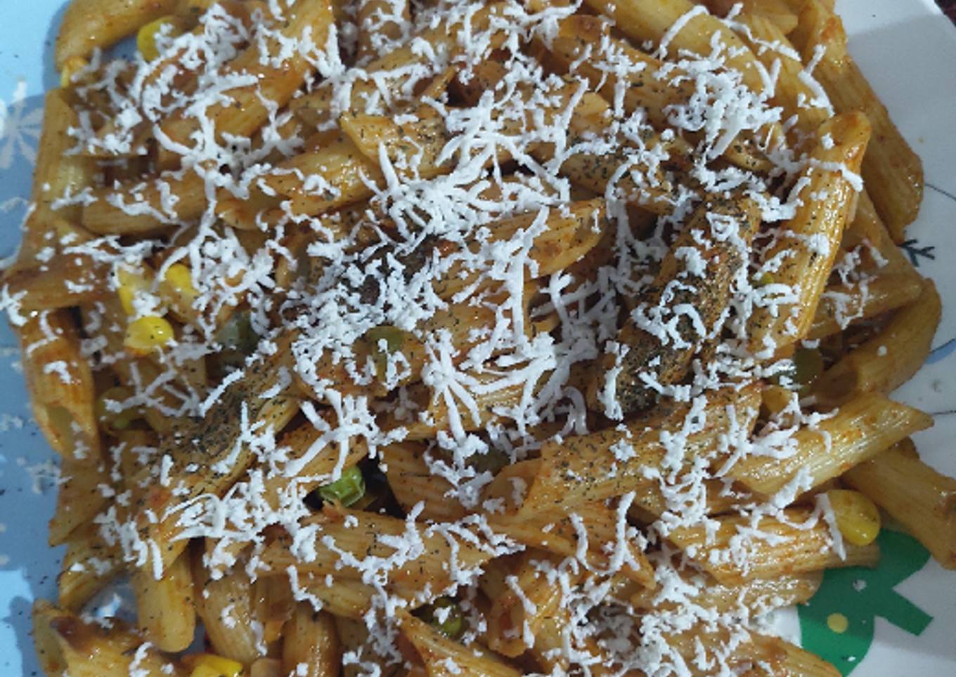 - Now add pasta mix well with the sauce add itallian herb for seasoning.serve hot in a serving dish.sprinkle any cheese.Now it's ready to eat.