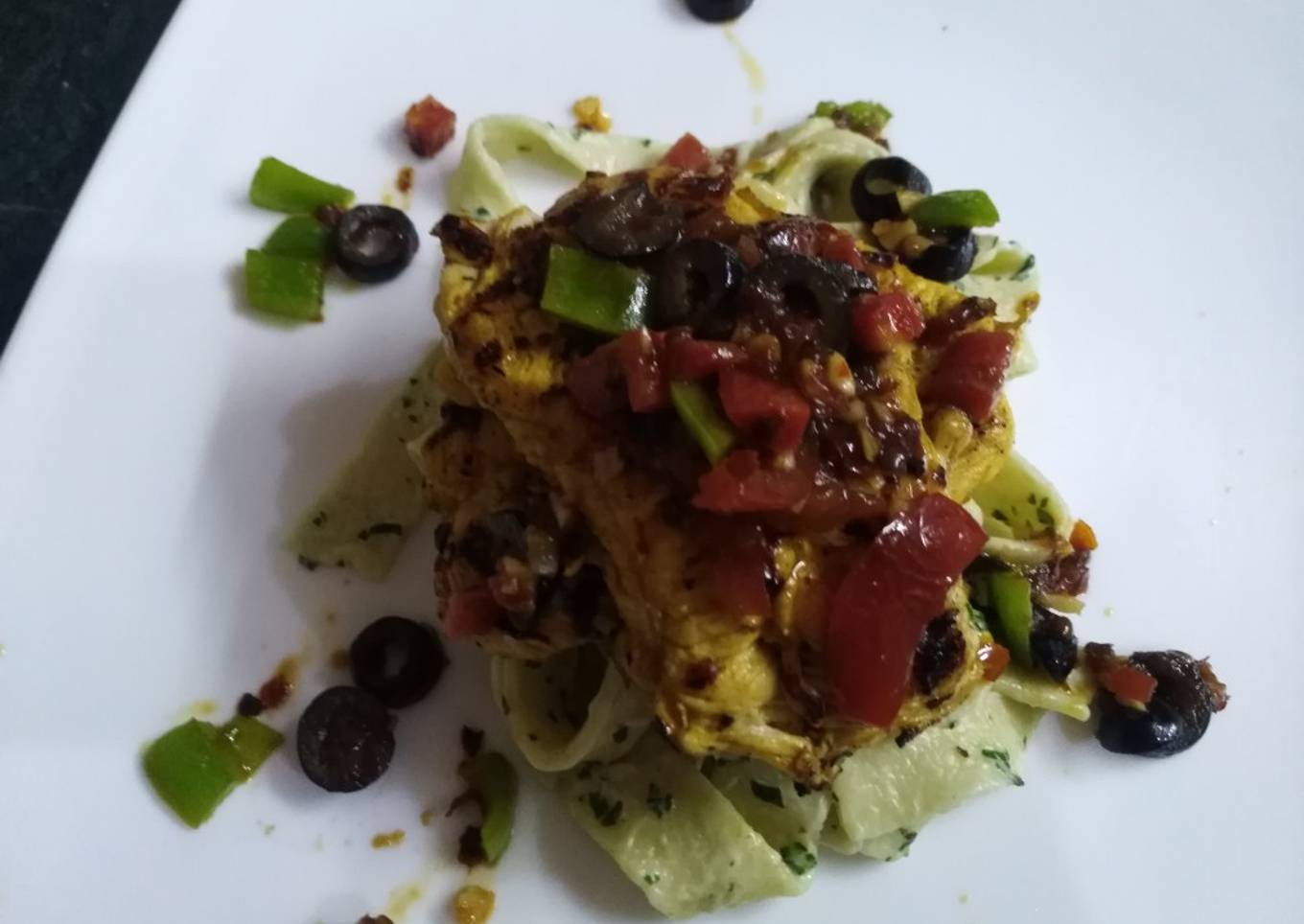 - Pasta ke uper grill chicken rakhein or us par vegetable sauce dal kar serve karein