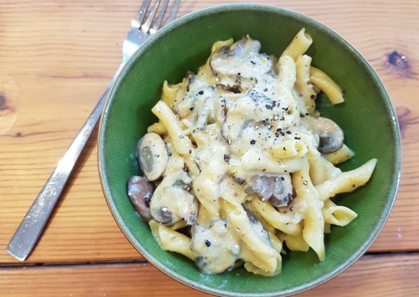- Add the mushrooms into the pasta pan and remove from the heat.