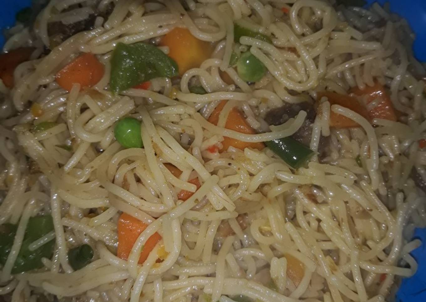 - Paboil your pasta and keep aside.boil your meat with your curry Maggie and salt and onions and keep.slice the meat and fry.
