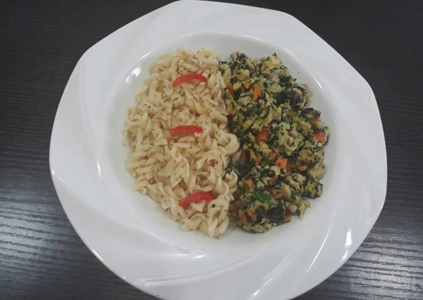 - Fry the onion,in vegetable oil then carrots,green pepper,fresh pepper,pour in the whisked egg.
