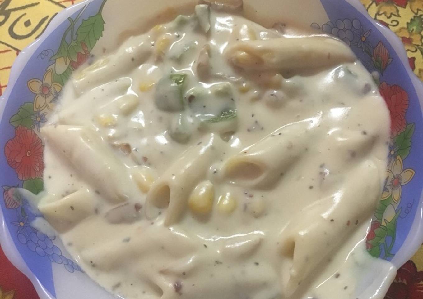 - Take a pan on low flame put butter let it melt put the maida fry it with fast hand don’t make it brown as the smell starts coming put milk into it use whisk so that it doesn’t have lumps ur hand should work continuously so that the sauce becomes nicely,slowly put milk into it now put salt black pepper oregano chilli flakes & 2 slices of cheese broken into pieces as soon as you see sauce is thick then put all your vegetables & then pasta & at last put little fresh cream into it now it’s ready.