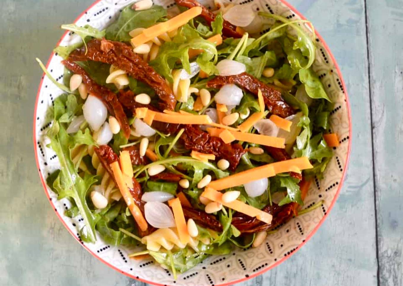 - In a large bowl mix together the rocket, pasta, sun dried tomatoes, pine nuts, pickled onions, cheese and seasoning Stir together the balsamic vinegar and olive oil Mix through the pasta salad and serve immediately