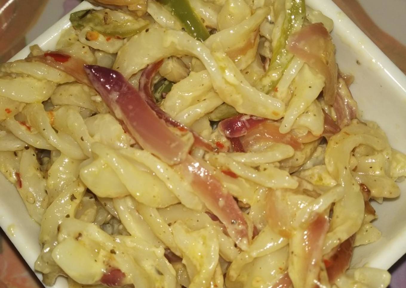 - Take a pan add oil and heat it add chopped onions And chopped capsicum cooked it and then put into mayonnise And then mixed it well