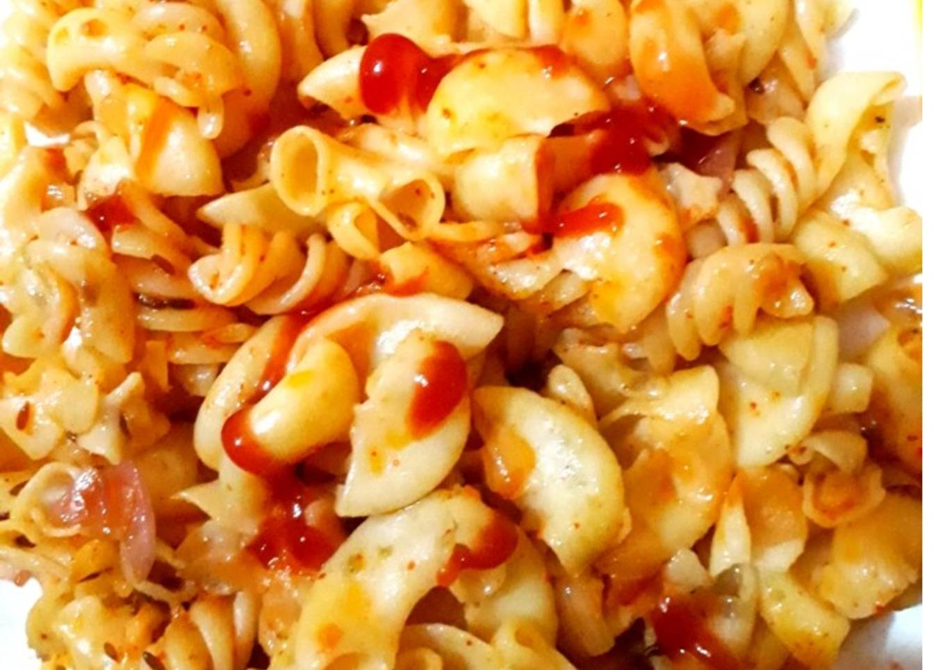 - Add boil macaroni,pasta,tomato sauce,salt,chilli powder and mix it and cook for 5 mints.