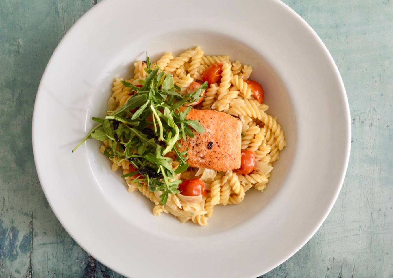 - Stir in the cooked pasta Plate the pasta, top with the salmon steak, some fresh rocket and a drizzle of balsamic glaze