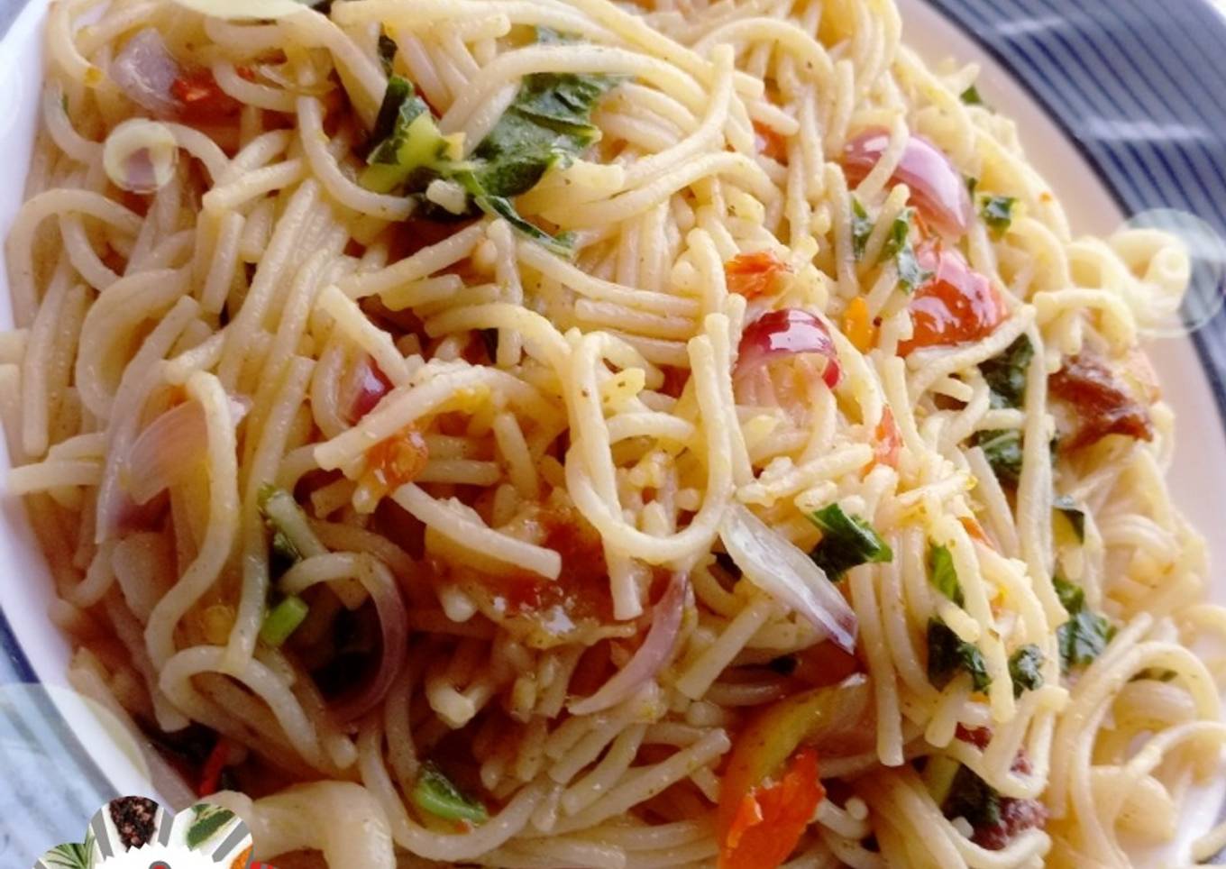 - Get a pan,add up oil n ur crushed ginger n stir. Add ur grated pepper n onion fry. Add ur seasoning n spice,and ur meat stock if any(u can add little water in its absence), add ur spinach n cook for 1min. Add ur ur pasta n sliced onions n continue stirring,cover n allow to simmer for 1 to 2 mins over low heat. Enjoy.