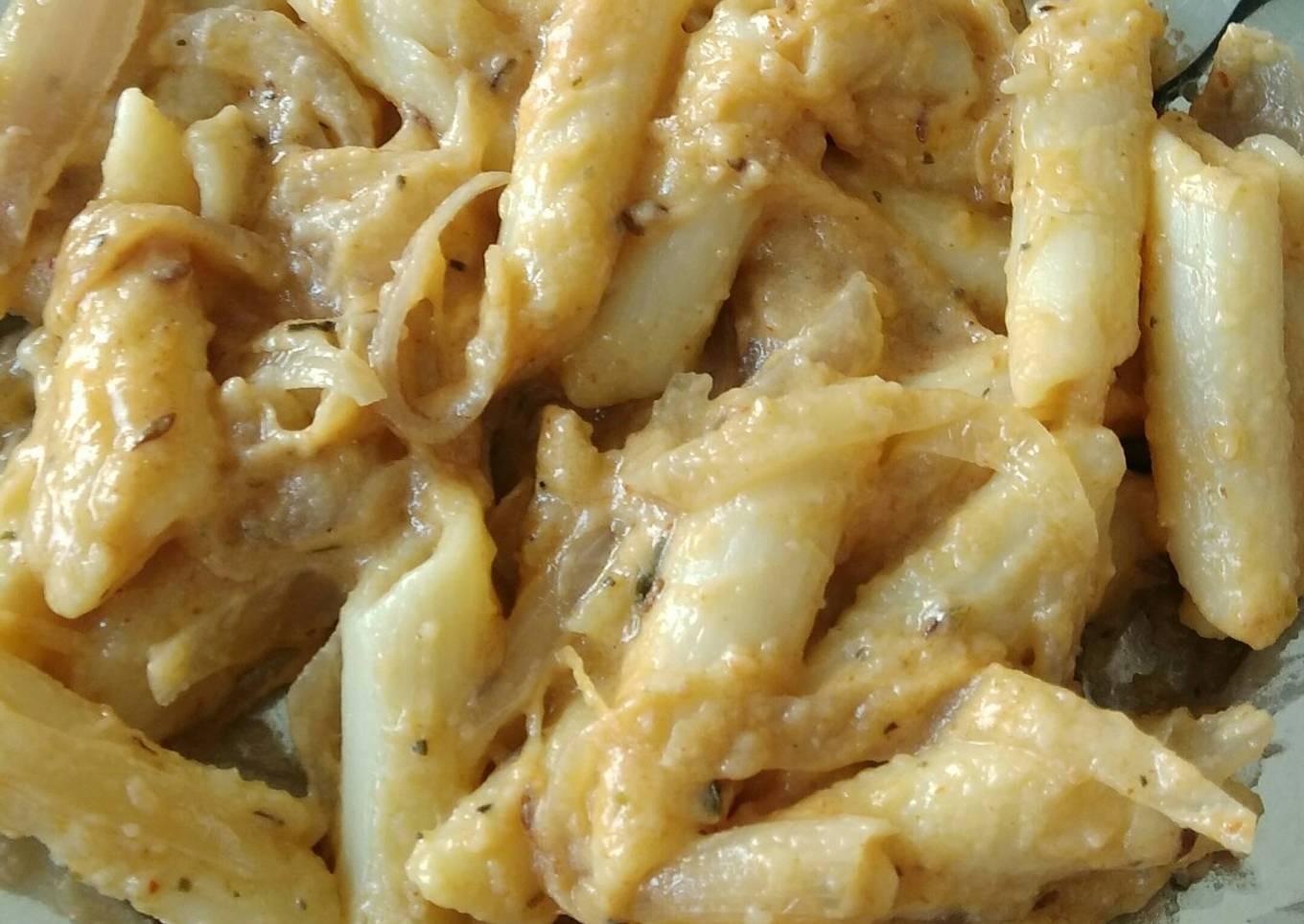 - In a pan.... Heat the oil.... And add 1tsp jeera and garlic and cooked it... Till it's get golden brown Colour after this add sliced onion and cooked for 7-8 minutes and then add tomato sauce, red Chilli sauce, soya sauce and mix it... And after this add salt and red Chilli powder.. Cook for 2 minutes and after this we add bread and milk sauce we made... And cooked it for 5 minutes... After this add boiled pasta..... And serve it