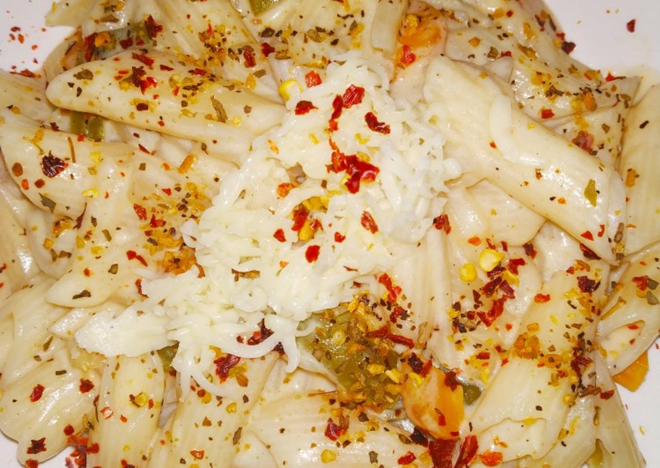 - In a pan put oil and butter and heat it then add garlic and all the chopped vegetables and FRY for 5 minutes then add salt it and pepper powder and white sauce and mix well and add water and add chilli flakes pizza herbs and add boiled pasta in them just cook for 2 minutes then add grated cheese and cook for 2 minutes and off the flame..