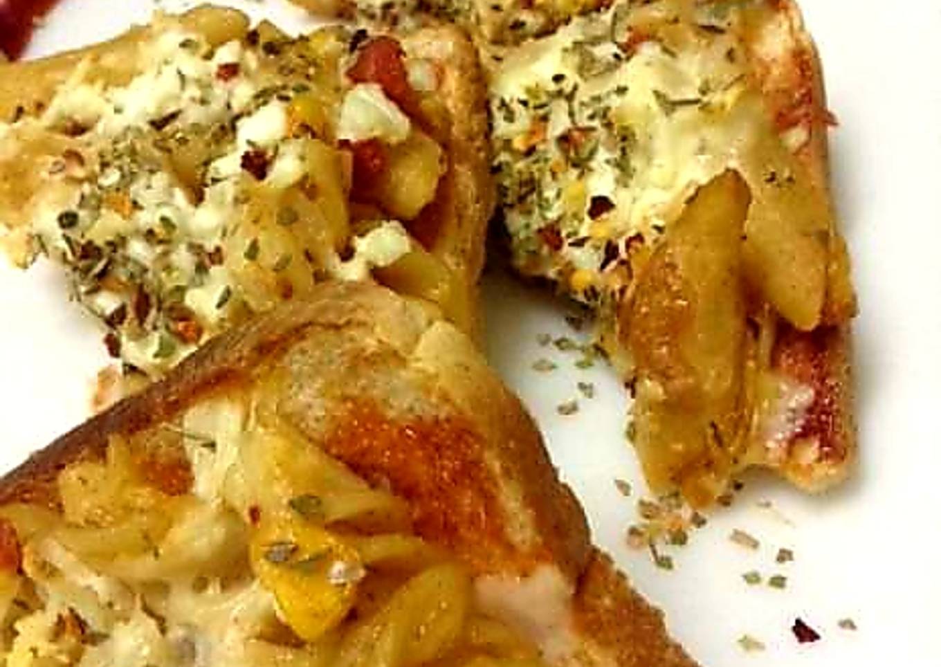 - Now take a bread apply ketchup on it and place pasta in it and spread some cheese in it and add some orgeno,chilli flakes and bake it for 10 mins or till the cheese melts