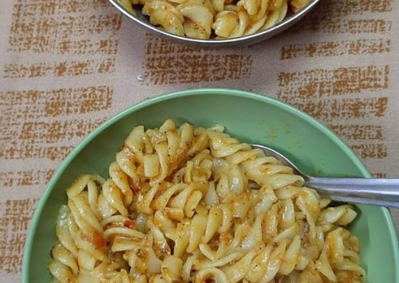 - Boil pasta in approx. 2.5 cups of water with little amt. of salt and 1 tsp of refined oil. Drain the water of pasta when it is done.